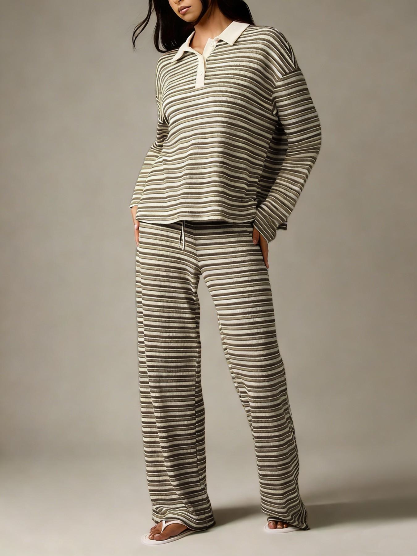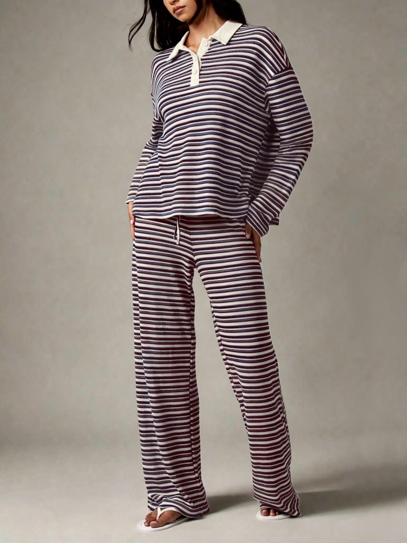 Women'S Off-Set Striped Long Sleeve Top & Wide Leg Pants Set, Womenswear Fall Winter Knit Loungewear, Comfortable Casual Streetwear, Pajama Set